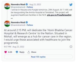 नई दिल्ली। प्रधानमंत्री नरेंद्र मोदी आज पंजाब के लोगों को होमी भाभा कैंसर अस्पताल की सौगात देंगे। मोहाली के न्यू चंडीगढ़ में बने इस अस्पताल के बाद पीएम एक जनसभा को संबोधित करेंगे। इस दौरान वे पंजाब को कुछ अन्य सौगात भी दे सकते हैं। जिले में धारा 144 लागू कर दी गई है।