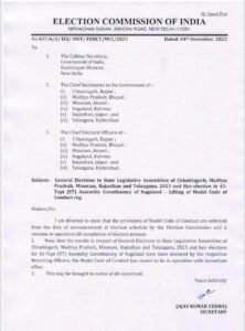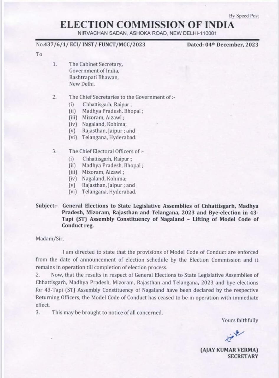 जारी आदेश में कहा गया है कि आदर्श आचार संहिता के प्रावधान चुनाव आयोग द्वारा चुनाव कार्यक्रम की घोषणा की तारीख से लागू होते हैं और यह चुनाव प्रक्रिया पूरी होने तक लागू रहते हैं. अब, छत्तीसगढ़, मध्य प्रदेश, मिजोरम, राजस्थान और तेलंगाना की राज्य विधानसभाओं के आम चुनाव, 2023 और नागालैंड के 43-तापी (एसटी) विधानसभा निर्वाचन क्षेत्र के लिए उप-चुनावों के परिणाम संबंधित रिटर्निंग द्वारा घोषित किए गए हैं. आदर्श आचार संहिता तत्काल प्रभाव से हटा दी गई है.