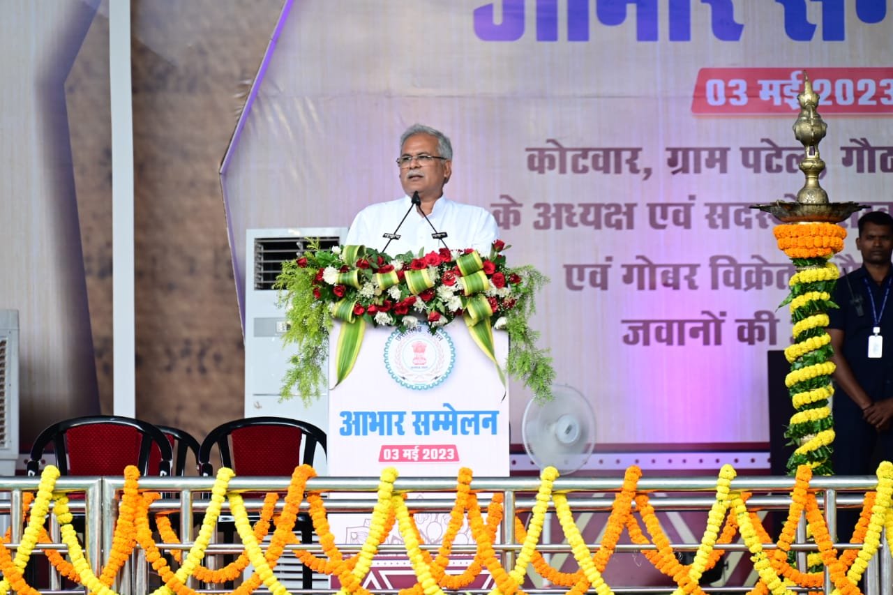 आभार सम्मेलन : मुख्यमंत्री श्री भूपेश बघेल ने सभा को संबोधित करते हुए कहा कि आज ग्राम पटेल, कोटवार, होमगार्ड और गौठान प्रबंधन समिति के सम्मेलन कार्यक्रम में मैं आप सभी का स्वागत, अभिनन्दन करता हूँ