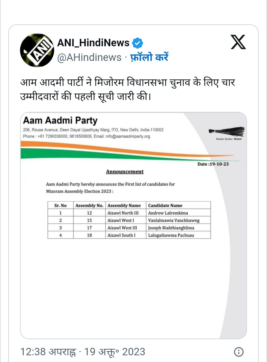 Mizoram AAP Candidates List: मणिपुर में नामांकन की आखिरी तारीख 20 अक्टूबर है और 21 अक्टूबर को नामांकन की जांच होगी। साथ ही, उम्मीदवार 23 अक्टूबर तक अपना नाम वापस ले सकेंगे। मालूम हो कि 40 सीटों के लिए विधानसभा चुनाव का आयोजन 7 नवंबर को किया जाएगा और 3 दिसंबर को इसके नतीजे घोषित होंगे।