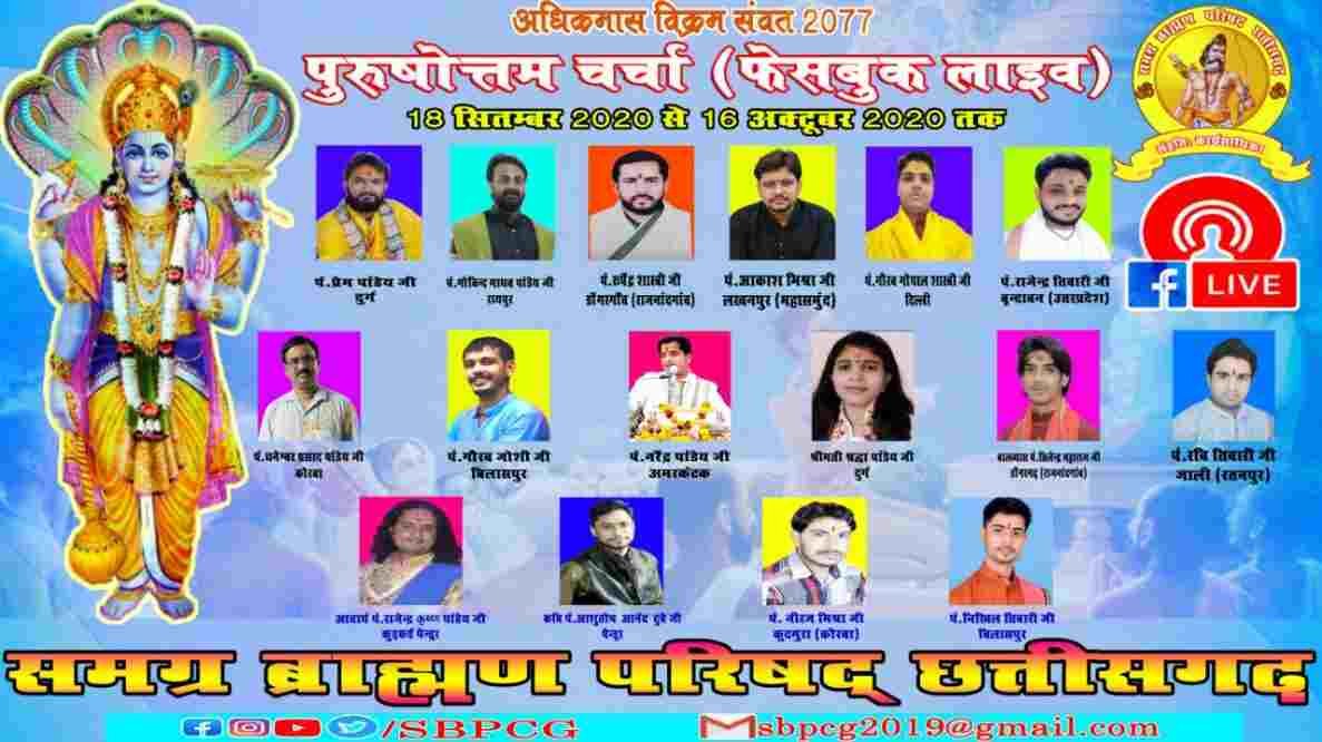 पुरुषोत्तम मास के इस विशेष अवसर पर पचास संस्थापक सदस्यों के सामूहिक निर्णय के संचालन सिद्धांत पर कार्यरत भारतवर्ष के प्रथम उत्कृष्ट सशक्त सामाजिक संगठन समग्र ब्राह्मण परिषद् छत्तीसगढ़ द्वारा छत्तीसगढ़ राज्य सहित भारतवर्ष के अन्य प्रांतों के श्रेष्ठ आध्यात्मिक प्रवक्ताओं द्वारा सोशियल साइट्स के फेसबुक मंच के माध्यम से भगवत् चर्चा का आयोजन किया जा रहा है.
