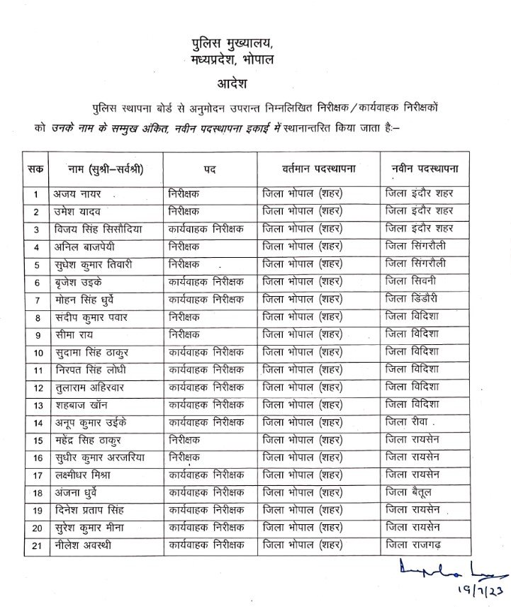 भोपाल ।  पुलिस विभाग में बड़ी प्रशासनिक सर्जरी की गई है। पुलिस महकमें ने 643 पुलिस कर्मियों का तबादला किया है। जिसमें कई TI और कार्यवाहक निरीक्षक के नाम  शामिल है । इस बदलाव से एक ही स्थान पर 3 साल से जमे TI प्रभावित हुए है।