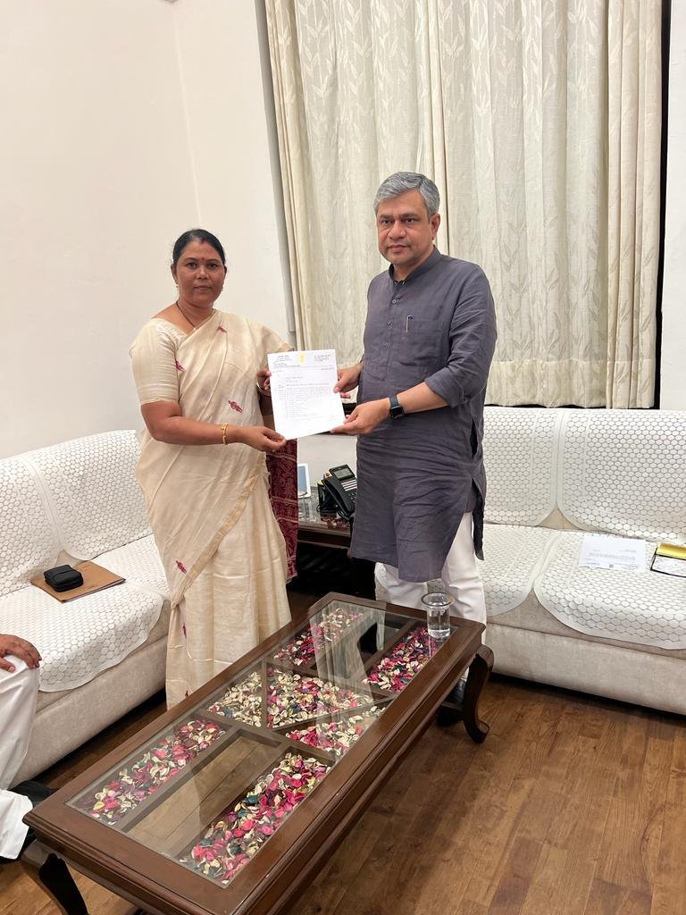 Raigarh News रायगढ़ । लोकसभा की लोकप्रिय सांसद श्रीमती गोमती साय ने आज दिल्ली में रेल मंत्री अश्वनी वैष्णव से मुलाक़ात कर रायगढ़ में अनेक ट्रेनों के ठहराव व स्टेशन में मूलभूत सुविधाओं में विकास के विषय में चर्चा की ।
