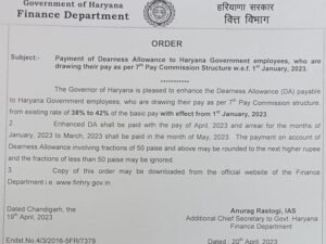 State Govt Employees DA Hike By 4 Percent चंडीगढ़ः केंद्र के बाद अब एक-एक कर राज्य सरकारें भी अपने कर्मचारियों के महंगाई भत्तें में बढ़ोतरी कर रही है। इन राज्यों की सूची में अब हरियाणा भी शामिल हो गया है। सरकार ने सरकार ने सूबे के कर्मचारियों के 4 प्रतिशत DA में बढ़ोतरी की है। राज्य सरकार के कर्मचारियों को अब 42 प्रतिशत डीए मिलेगा। बढ़ा हुआ डीए 1 जनवरी 2023 से लागू होगा। यानी सरकार 4 महीनों का एरियर भी मिलेगा।