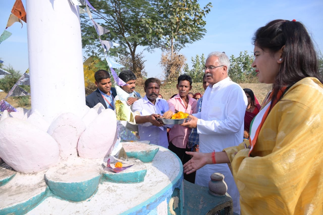 ग्राम लाहोद में मुख्यमंत्री श्री भूपेश बघेल ने श्री अघनू कोसले के घर के सामने स्थित जैत-खंब पर पूजा-अर्चना कर प्रदेशवासियों के सुख-समृद्धि और खुशहाली की कामना की