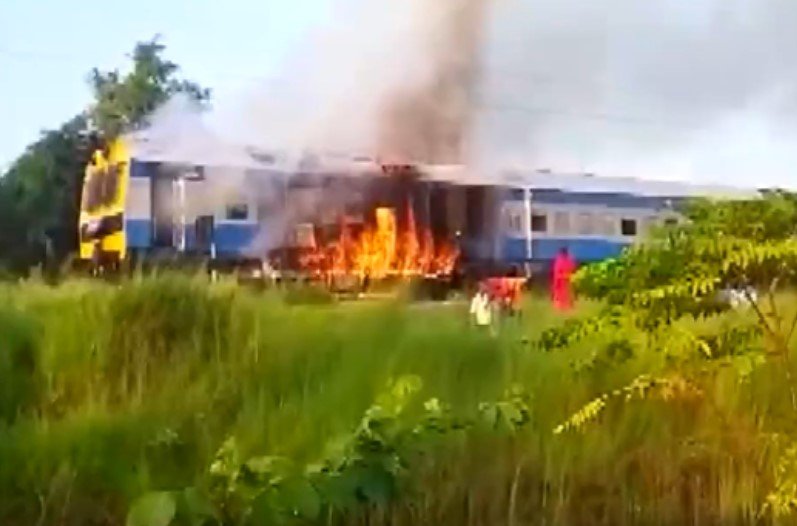 fire broke out in engine of DEMU मिली जानकारी के अनुसार पैसेंजर ट्रेन रक्सौल से नरकटियागंज जा रही थी, लेकिन इसी दौरान भेलवा स्टेशन के पास ट्रेन के इंजन में आग लग गई। रक्सौल-नरकटियागंज डीएमयू ट्रेन के सभी यात्री सुरक्षित बताए गए हैं। फिलहाल आग के कारण का अभी पता नहीं चला है।