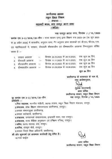 CG School holiday जारी आदेश के मुताबिक दशहरा में 6 दिन, दिवाली में भी 6 दिन, शीतकालीन में भी 6 दिन और ग्रीष्मकालीन में 46 दिनों के लिए यानि कुल 64 दिन छुट्टी रहेगी।