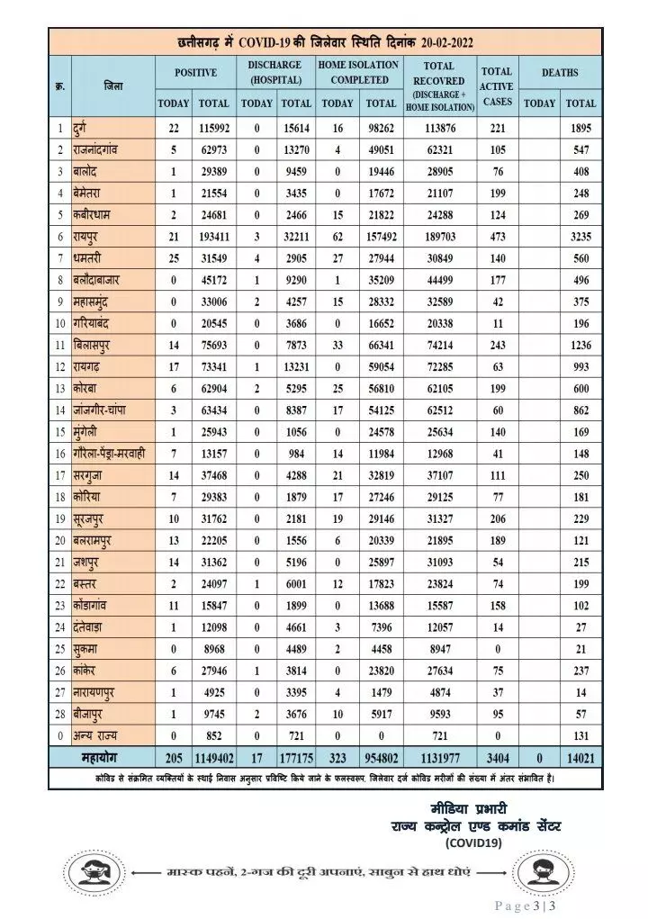 रायपुर। कोरोना वायरस को लेकर छग स्वास्थ्य विभाग ने मेडिकल बुलेटिन जारी किया है. बुलेटिन के मुताबिक आज 205 नए कोरोना पॉजिटिव मरीज़ों की पहचान की गई है। जिसमें सबसे ज्यादा मरीज राजधानी रायपुर, रायगढ़, दुर्ग, राजनांदगांव और कवर्धा से है और 340 मरीज़ स्वस्थ होने के उपरांत डिस्चार्ज/रिकवर्ड हुए। वही आज एक भी मरीज की मौत नहीं हुई है।