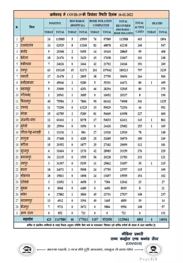 RGHNEWS,16 फरवरी2022,रायपुर। कोरोना वायरस को लेकर छग स्वास्थ्य विभाग ने मेडिकल बुलेटिन जारी किया है. बुलेटिन के मुताबिक आज 433 नए कोरोना पॉजिटिव मरीज़ों की पहचान की गई है। जिसमें सबसे ज्यादा मरीज राजधानी रायपुर, रायगढ़, दुर्ग, राजनांदगांव और कवर्धा से है और 1107 मरीज़ स्वस्थ होने के उपरांत डिस्चार्ज/रिकवर्ड हुए। वही 4 मरीजों की इलाज के दौरान मौत हुई है।