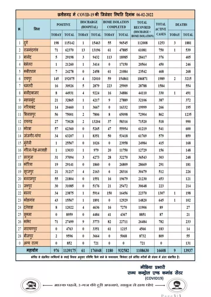 RGHNEWS,6फरवरी2022,छत्तीसगढ़,रायपुर:कोरोना वायरस को लेकर छग स्वास्थ्य विभाग ने मेडिकल बुलेटिन जारी किया है. बुलेटिन के मुताबिक आज 976 नए कोरोना पॉजिटिव मरीज़ों की पहचान की गई है. जिसमें सबसे ज्यादा मरीज राजधानी रायपुर, रायगढ़, दुर्ग, राजनांदगांव और कवर्धा से है.और 1241 मरीज़ स्वस्थ होने के उपरांत डिस्चार्ज/रिकवर्ड हुए। वही 9 मरीजों की इलाज के दौरान मौत हुई है.