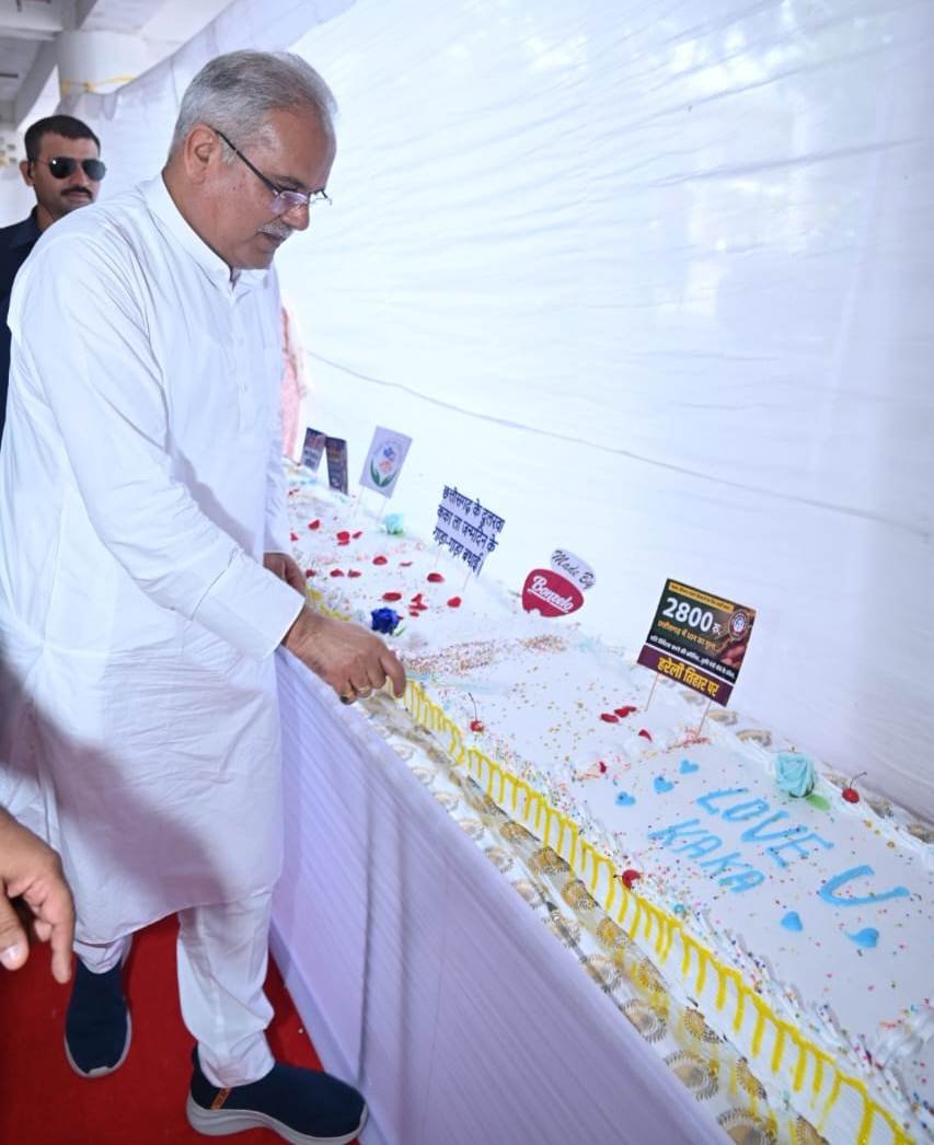 केक की खास बात यह थी कि इस लंबे केक में मुख्यमंत्री श्री भूपेश बघेल की फ्लैगशिप योजनाओं को भी प्रदर्शित किया गया। मुख्यमंत्री की किसान हितैषी योजनाओं से लेकर हर वर्ग के लिए बनाई जाने वाली योजनाओं तक सभी प्रमुख योजनाओं को समेटने की कोशिश इसमें की गई।