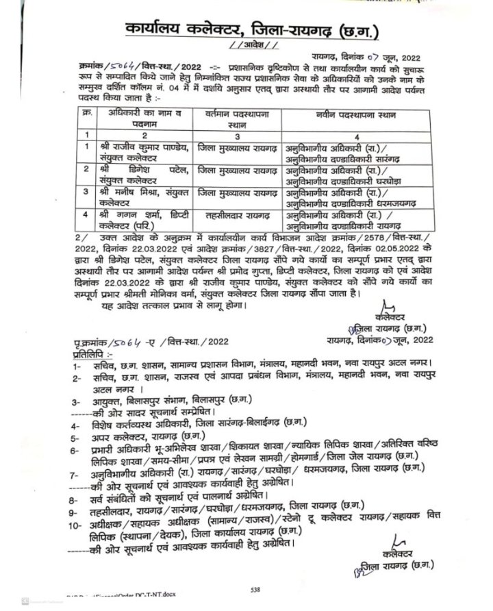 Raigarh News रायगढ़, 7 जून 2022/ कलेक्टर श्री भीम सिंह ने प्रशासनिक दृष्टिकोण से तथा कार्यालयीन कार्य को सुचारू रूप से संपादित किए जाने हेतु राज्य प्रशासनिक सेवा के अधिकारियों को अस्थायी तौर पर आगामी आदेश पर्यन्त नवीन पदस्थापना आदेश जारी किया है। जिसमें संयुक्त कलेक्टर श्री राजीव कुमार पाण्डेय को अनुविभागीय अधिकारी राजस्व सारंगढ़ में पदस्थ किया गया है। इसी तरह संयुक्त कलेक्टर श्री डिगेश पटेल को अनुविभागीय अधिकारी राजस्व घरघोड़ा, संयुक्त कलेक्टर श्री मनीष मिश्रा को अनुविभागीय अधिकारी राजस्व धरमजयगढ़ एवं डिप्टी कलेक्टर श्री गगन शर्मा को अनुविभागीय अधिकारी राजस्व रायगढ़ में पदस्थ किया गया है।