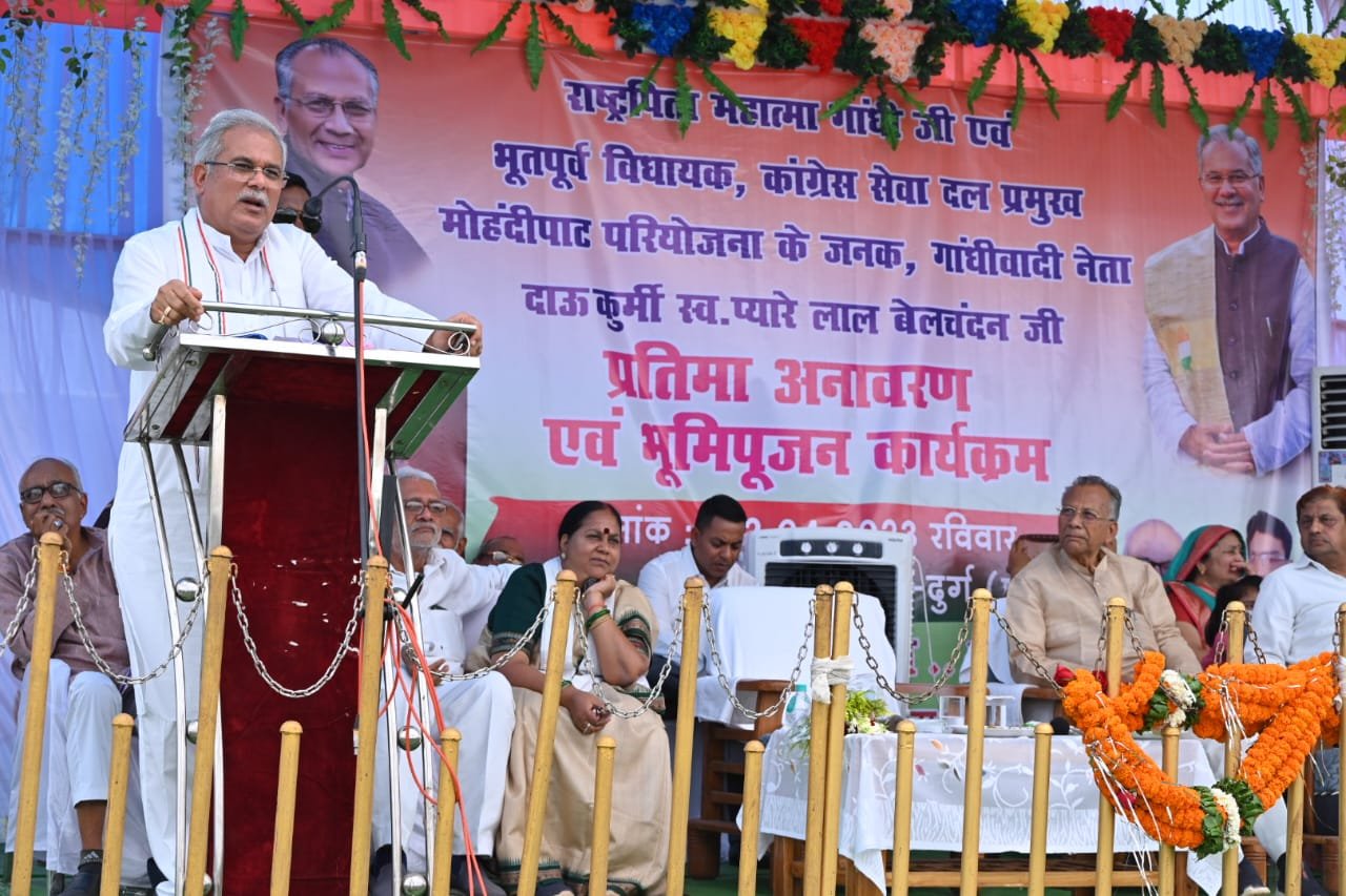 दाऊ स्व.प्यारेलाल बेलचंदन जी की प्रतिमा के अनावरण के अवसर पर अपने सम्बोधन में मुख्यमंत्री श्री भूपेश बघेल ने कहा कि तिरगा में आज गांधी जी और दाऊ जी की मूर्ति का अनावरण करने का मौका मिला है