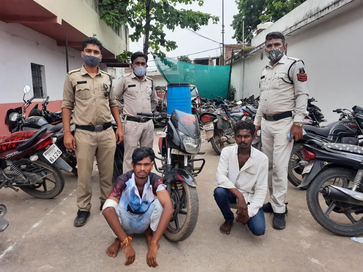 जानकारी के अनुसार आज दिनांक 26/08/2021 के सुबह करीब 10:00 बजे चौकी प्रभारी जूटमिल को छातामुड़ा की ओर से दो लड़कों द्वारा बाइक पर शराब लेकर जूटमिल की ओर आने की सूचना मिला । सूचना पर चौकी प्रभारी पेट्रोलिंग पार्टी को नाकेबंदी कर कार्रवाई का निर्देश दिये । पेट्रोलिंग पार्टी द्वारा *सांई पेट्रोल पंप छातामुड़ा रोड के पास* एक लाल काला पल्सर बाइक पर 20 लीटर क्षमता वाले गोल प्लास्टिक डब्बा को बीच में रखकर आ रहे युवकों को रोककर चेक किया गया । प्लास्टिक डिब्बा के अंदर करीब *19 लीटर महुआ शराब कीमती 1900 रुपए* का पाया गया । दोनों युवक इसे अवैध रूप से बिक्री करने लेकर आना बताये । आरोपी 1- चंदन शाह पिता बांकेलाल शाह उम्र 28 वर्ष 2- अर्जुन साहू पिता चंदेशर साहू उम्र 19 वर्ष दोनों निवासी पुलिस चौकी पीछे जूटमिल से महुआ शराब एवं बजाज पल्सर मोटरसाइकिल क्रमांक *सीजी 13 एजे 0339 कीमती करीब ₹80,000* को जप्त कर आरोपियों के विरुद्ध धारा 34(2),59(क) आबकारी एक्ट के तहत कार्यवाही कर आरोपियों को रिमांड पर भेजा गया है ।