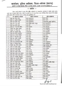SP Issue Transfer order of 161 Policemen कोरबा: छत्तीसगढ़ के कोरबा पुलिस में एक बार फिर बड़ा फेरबदल हुआ है। यहां एक साथ 161 पुलिसकर्मियों को इधर से उधर किया गया है। इनमें 41 प्रधान आरक्षक व 120 आरक्षक शामिल है। इस संबंध में जिले के एसपी यू उदय किरण ने आदेश जारी कर दिया है।
