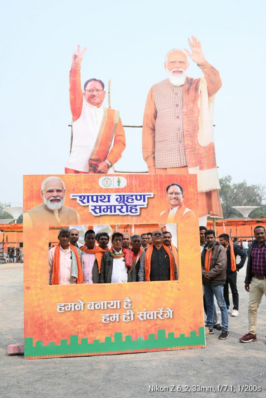 शपथ ग्रहण समारोह को ऐतिहासिक बनाने के उद्देश्य से पूरा कार्यक्रम स्थल को प्रधानमंत्री नरेंद्र मोदी एवं मुख्यमंत्री विष्णुदेव साय के बड़े बड़े कट-आउट के साथ सजाया गया है। दूर दराज से पहुंच रहे आम नागरिक इन कट-आउट के साथ सेल्फी एवं फोटो खिंचाते दिख रहे है।