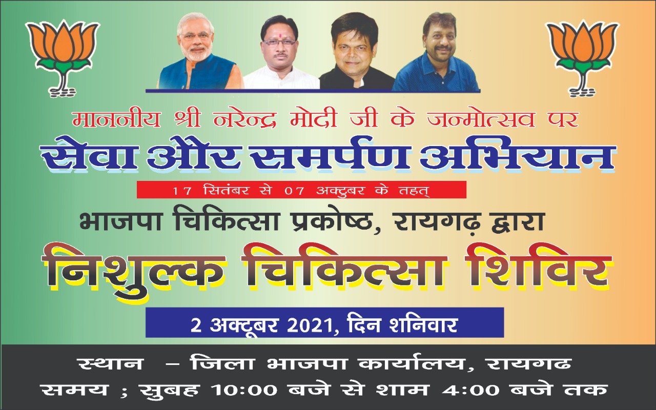 RGHNEWS PRASHANT TIWARI रायगढ़ – भारतीय जनता पार्टी, जिला रायगढ़ के चिकित्सा प्रकोष्ठ द्वारा भारत के यशस्वी प्रधानमंत्री माननीय नरेंद्र मोदी जी के जन्मदिवस और उनके 20 वर्ष जनसेवक के रूप में पूर्ण होने के उपलक्ष्य में 17 सितंबर से 7 अक्टूबर तक सेवा और समर्पण अभियान चलाया जा रहा है । उक्त अभियान के तहत जिला भाजपा कार्यालय में 2 अक्टूबर गांधी जयंती के दिन विशाल स्वास्थ्य शिविर का आयोजन किया जा रहा है।