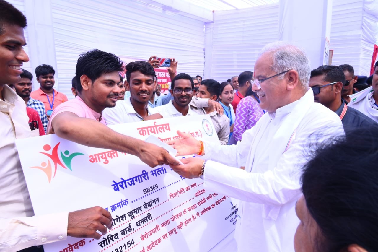 प्रदेश के मुख्यमंत्री श्री भूपेश बघेल आज धमतरी विधानसभा के ग्राम भटगांव में भेंट-मुलाकात के दौरान हितग्राहियों को प्रतीकात्मक तौर पर सामग्री और चेक का वितरण किया। इनमें स्वास्थ्य विभाग की ओर से राष्ट्रीय बाल स्वास्थ्य कार्यक्रम (चिरायु) के तहत पांच हितग्राहियों को सामग्री वितरण, जल संसाधन विभाग की ओर से 23 नवनियुक्त उप अभियंताओं को नियुक्ति पत्र, राजस्व एवं आपदा प्रबंधन विभाग की ओर से 30 हितग्राहियों को विभिन्न योजनाओं के तहत प्रमाण पत्र प्रदाय किया। इनमें छत्तीसगढ़ शासन के नवीन सरलीकरण योजना के तहत जारी जाति प्रमाण पत्र, वनग्राम से राजस्व ग्राम अभिलेख अद्यतन और सर्वेक्षण ग्राम का प्रमाण पत्र शामिल है। इसी तरह जनपद पंचायत धमतरी के पांच, नगरपालिक निगम धमतरी के 314 और नगर पंचायत आमदी के पांच हितग्राहियों को बेरोजगारी भत्ता योजना के तहत स्वीकृति आदेश पत्र का वितरण किया। जनपद पंचायत धमतरी की ओर से राष्ट्रीय परिवार सहायता योजना के तीन और राजीव गांधी भूमिहीन कृषि मजदूर न्याय योजना के 5 हितग्राहियों को लाभान्वित किया।