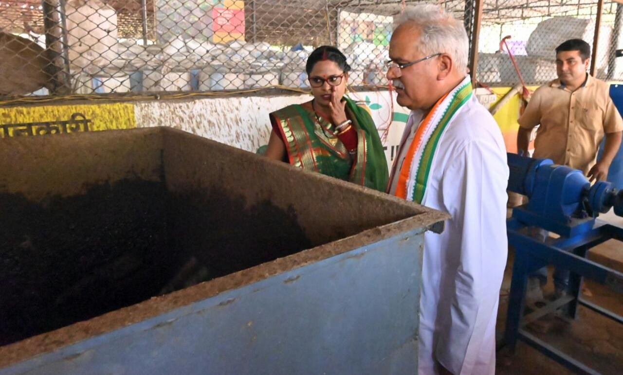 मुख्यमंत्री श्री भूपेश बघेल आज भेंट-मुलाकात कार्यक्रम के दौरान हीरापुर जरवाय शहरी गौठान का निरीक्षण किया। उन्होंने वहां गोबर से पेंट बनाने की इकाई का भी अवलोकन कर वर्मी कम्पोस्ट और पेंट निर्माण से जुड़ी महिलाओं से चर्चा की।