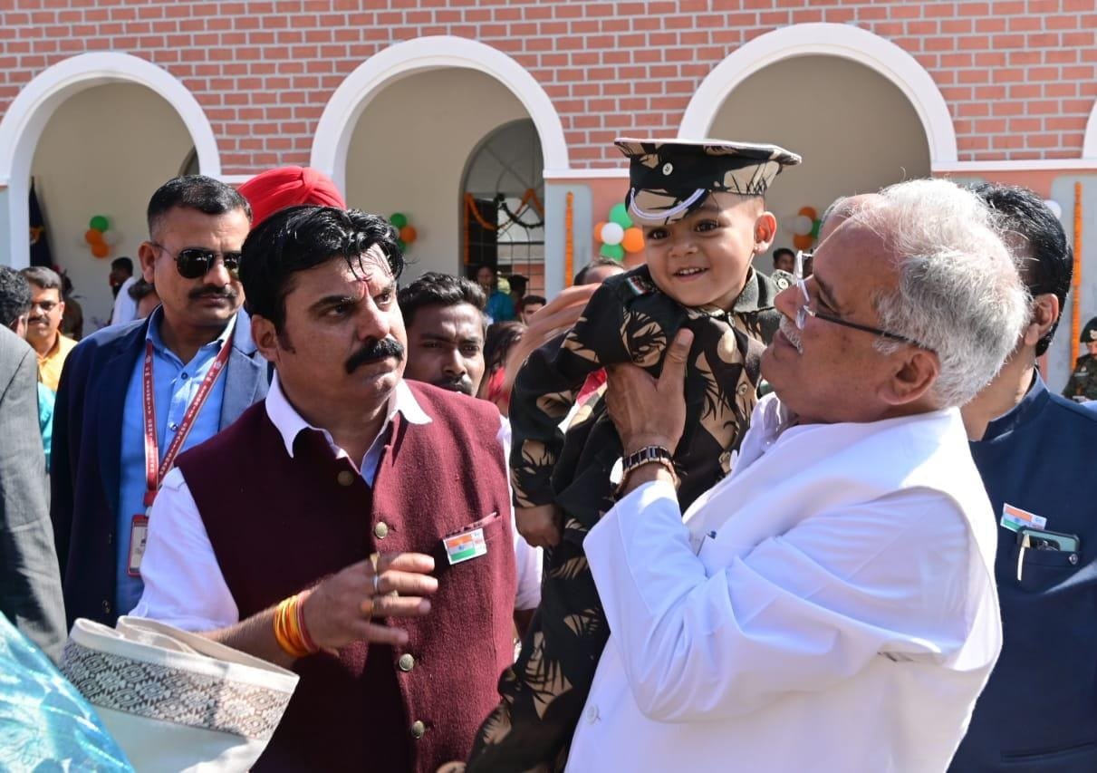 मुख्यमंत्री श्री भूपेश बघेल आज जगदलपुर में ‘अमर वाटिका’ का लोकार्पण करने के बाद जब शहीदों के परिजनों को शॉल और श्रीफल देकर सम्मानित कर रहे थे। तो अपनी मां के साथ सैनिक की ड्रेस में आए नन्हे बालक को देख, मुख्यमंत्री ने बालक को गोद में उठाकर दुलारा।