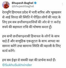 मुख्यमंत्री भूपेश बघेल ने की घोषणा, हिमाचल के आपदा पीड़ितों के लिए छत्तीसगढ़ वासियों की ओर से 11 करोड़ रुपये की सहायता…