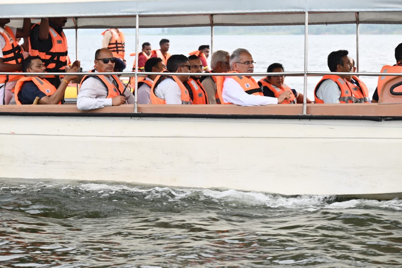 रायपुर, 03 जुलाई 2022 मुख्यमंत्री बोट राइड कर पहुंचे झुमका जलाशय के बीचों बीच झुमका आईलैंड पर