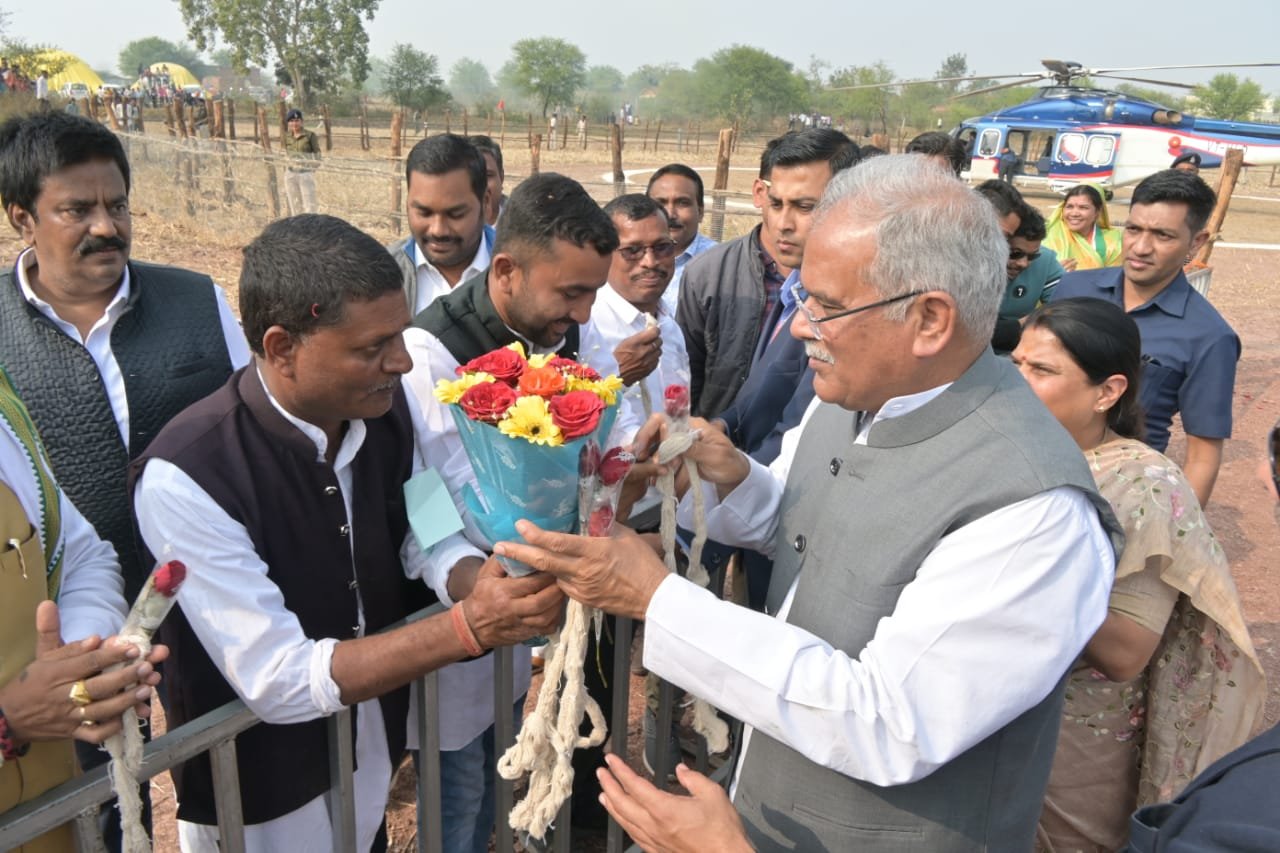 मुख्यमंत्री श्री भूपेश बघेल भेंट-मुलाकात के लिए तखतपुर विधानसभा के ग्राम खैरी हेलीपैड पहुंचे