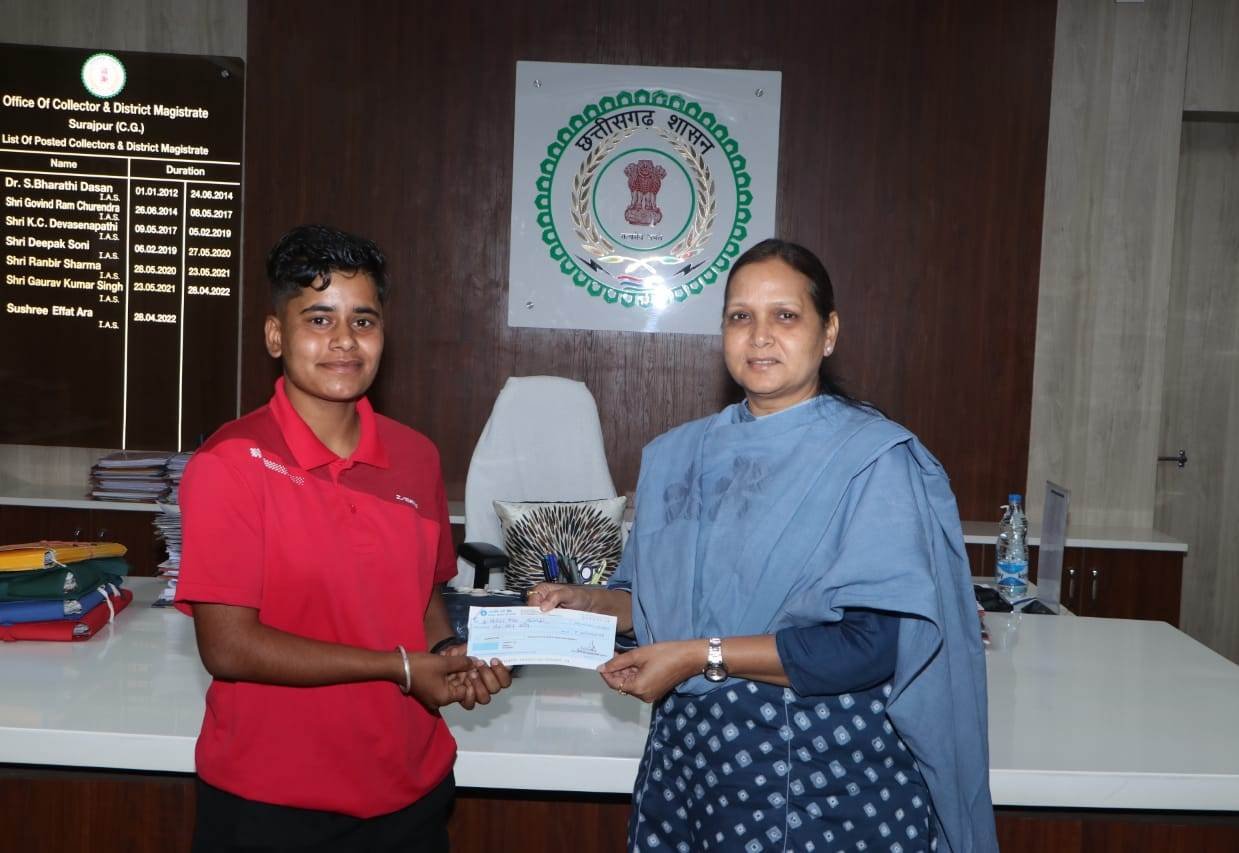 मुख्यमंत्री श्री भूपेश बघेल द्वारा स्वेच्छानुदान के तहत दी गई 5 लाख रूपये की आर्थिक सहायता राशि का चेक शुक्रवार को कलेक्टर सुश्री इफ्फत आरा ने निगिता यादव को प्रदान किया। गौरतलब है कि सूरजपुर निवासी 19 वर्षीय निगिता यादव, पिता श्री लक्ष्मण यादव ने तमिलनाडु में आयोजित राष्ट्रीय किक बॉक्सिंग प्रतियोगिता (वर्ग-48 किग्रा) वर्ष 2022 में रजत पदक हासिल किया था। इसके बाद उनका चयन दुबई में आयोेजित होने वाली किक बॉक्सिंग की अंतर्राष्ट्रीय प्रतियोगिता के लिए हुआ है। इसके पूर्व भी उन्होंने कई प्रतियोगिताओं में उत्कृष्ट प्रदर्शन किया है।