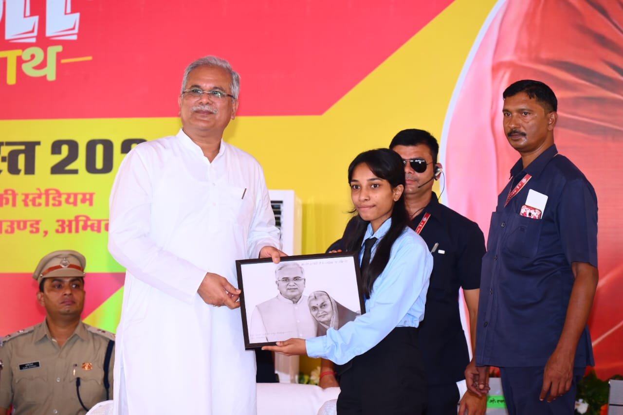 मुख्यमंत्री श्री भूपेश बघेल के स्वागत में सरगुजा के केआर कॉलेज के छात्र अंकित गुप्ता, आई एन आर सी कॉलेज की छात्रा वैशाली ने मुख्यमंत्री को स्केच भेंट किया