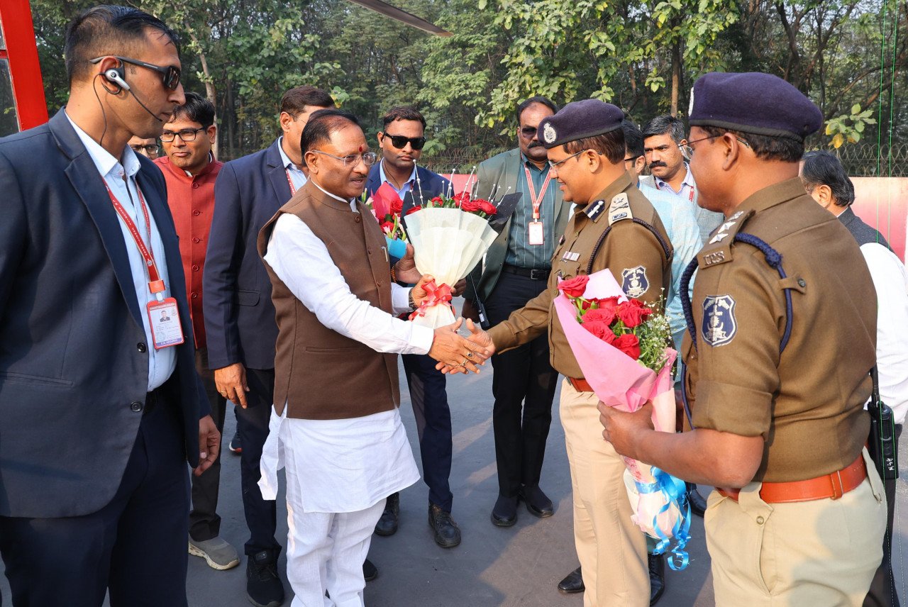मुख्यमंत्री श्री विष्णु देव साय ओ पी जिंदल एयर स्ट्रीप रायगढ़ पहुँचे