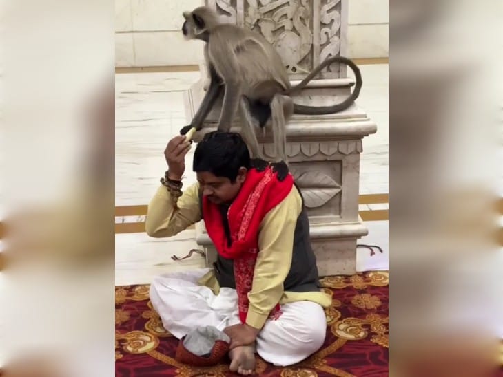 राम मंदिर में अचानक आया बंदर….बैठकर सुनने लगा भजन,देखिये कैसे कर रहा मस्ती