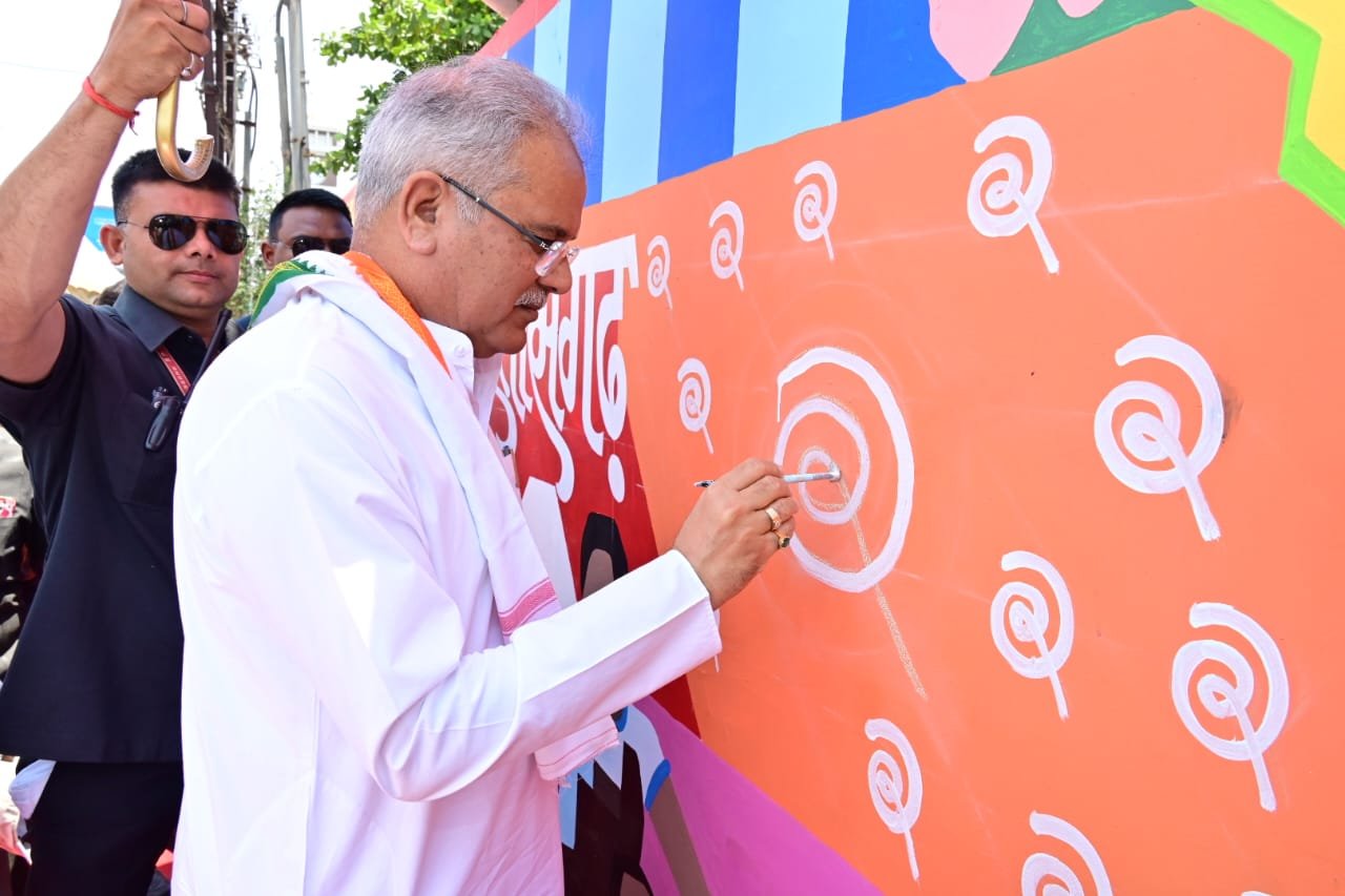 रायपुर उत्तर विधानसभा : मुख्यमंत्री श्री भूपेश बघेल ने घड़ी चौक में स्थित वाल अमर चिन्हारी हमर छत्तीसगढ़ में अपने हाथों से G20 समिट का लोगो बनाया