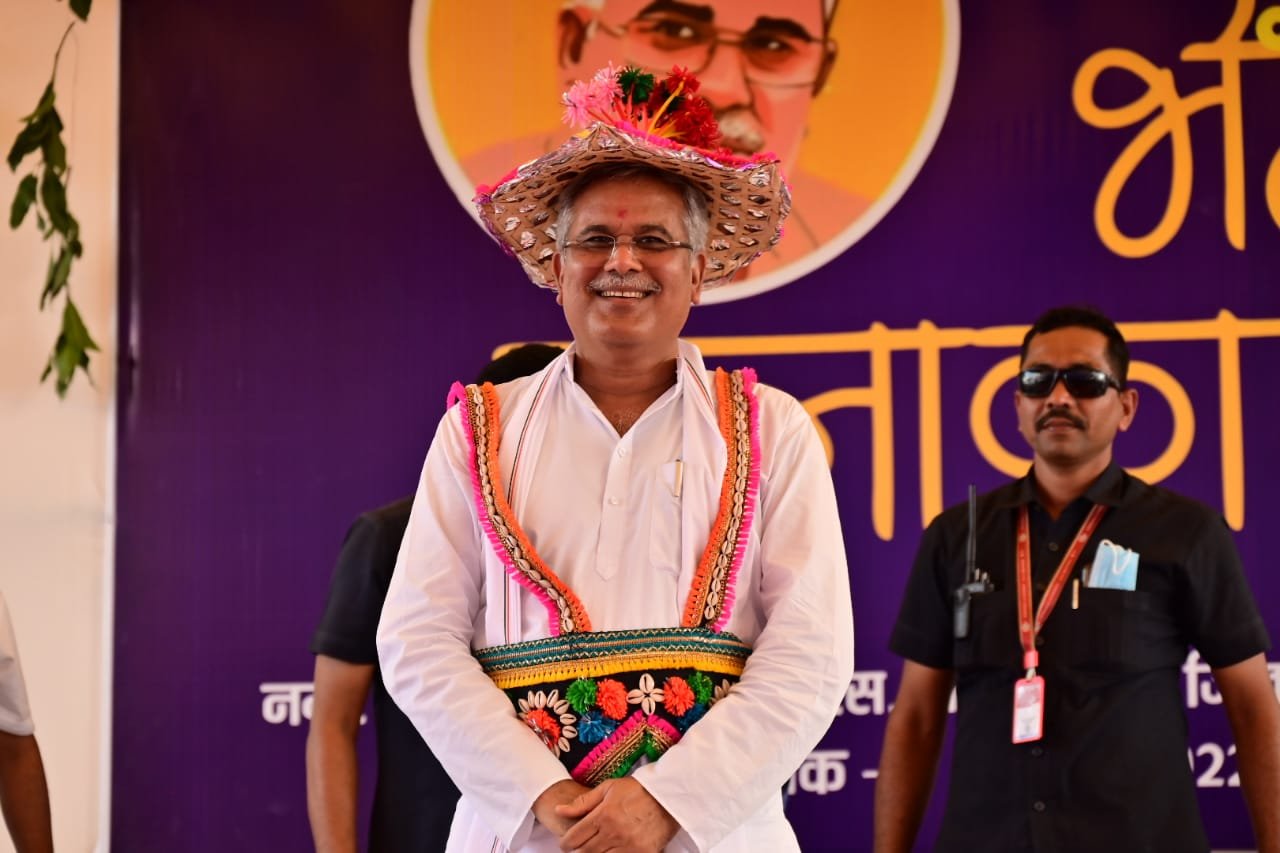 यहां ग्रामीणों ने मुख्यमंत्री श्री भूपेश बघेल का पारंपरिक खुमरी पहनाकर स्वागत किया गया।