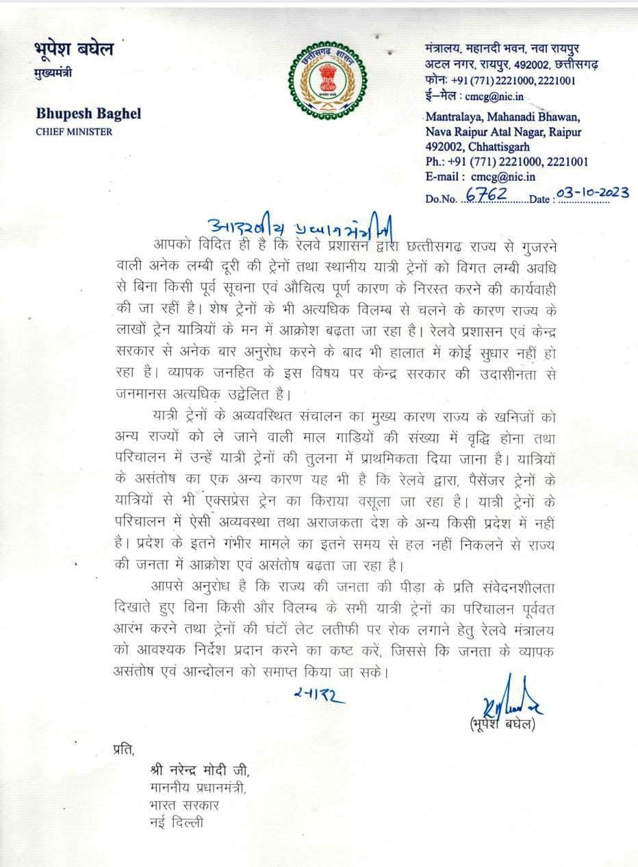 रेलों के अनियमित चालन, कभी भी निरस्त किये जाने से आम जनता हलाकान, मुख्यमंत्री श्री भूपेश बघेल ने प्रधानमंत्री श्री नरेंद्र मोदी को पत्र लिखकर कराया अवगत
