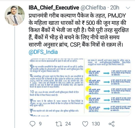 भारतीय बैंक संघ ने ट्वीट कर ये जानकारी दी है और खाताधारकों से कहा है कि आपकी पैसे पूरी तरह सुरक्षित हैं बैंकों में भीड़ से बचने के लिए नीचे वाले समय सारणी के अनुसार ब्रांच, CSP, बैंक मित्रों से रक़म लें। सरकार ने महिला खाताधारकों के खाते में 500₹ की तीसरी किस्त डालना शुरू कर दिया है