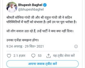 *✍️कांग्रेस पर सवाल उठाने वाले नेताओं को लेकर सीएम भूपेश बघेल ने ट्वीट कर कही ये बात…..*