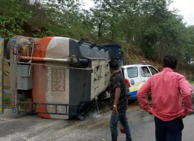 RGHNEWS प्रशांत तिवारी दुलमी, रामगढ़/-* रजरप्पा थाना क्षेत्र के गोला-चारु रोड पर शुक्रवार को मुर्गी दाना लोडेड ट्रक ब्रेक फेल होने से घाटी में पलट गया। ड्राइवर केबिन में फंस गया। घटना की सूचना के बाद मौके पर पुलिस पहुंची। जवानों को उतार पीसीआर वैन गैस कटर लाने के लिए जा रही थी कि पीछे से आ रहे डीजल लोडेड टैंकर ने वैन में टक्कर मार दी। इससे टैंकर मौके पर पलट गया और सड़क पर डीजल बहने लगा। इस घटना में टैंकर, पीसीआर और ट्रक ड्राइवर जख्मी हुए हैं। इसमें ट्रक ड्राइवर की स्थिति गंभीर है।