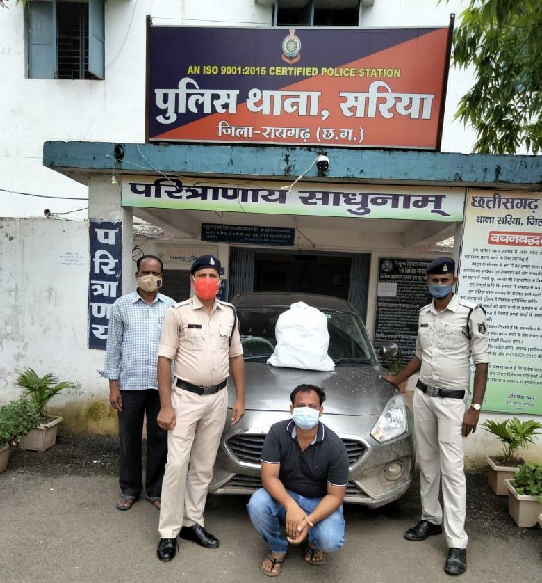 जानकारी के अनुसार दिनांक 03/07/2021 को थाना प्रभारी सरिया निरीक्षक डी.के. मार्कण्डेय को मुखबिर से सूचना मिला कि एक व्यक्ति *मारूति डिजायर क्र. AG-10-AP-7326* में उडिसा की ओर से छत्तीसगढ़ होते हुये मादक पदार्थ गांजा परिवहन कर जाने वाला है । मुखबीर सूचना पर थाना प्रभारी द्वारा कंचनपुर बेरियर में लगे स्टाफ को सचेत होकर ओडिशा की ओर से आ रही प्रत्येक वाहन की बारीकी से जांच करने के निर्देश दिये । नाकेबंदी में लगी टीम द्वारा दिनांक 03/07/2021 को देर शाम उडिसा की ओर से सरिया जाने वाली मेन रोड में कंचनपुर बेरियर में एक मारूती डिजायर क्र0 CG 10 AP 7326 में एक व्यक्ति को सवार होकर तेज रफ्तार से आते देख रोका गया, मुखबीर के बताये अनुसार मारूति डिजायर के नम्बर प्लेट को देखकर नम्बर मिलान किया गया जो सही पाया गया । मारूती डिजायर चालक को पूछताछ करने पर अपना नाम *शुभम अग्रवाल पिता स्व0 राजेन्द्र कुमार अग्रवाल उम्र 25 वर्ष सा0 चांटीडीही बिलासपुर थाना सरकंडा जिला बिलासपुर* का होना बताया । कार के डिक्की में एक चेकदार बैग के अंदर 07 पैकेट 01-01 किलो ग्राम का पालिथिन में पैक मादक पदार्थ गांजा कुल *07 किलो कीमत करीबन 35,000 रूपये* मिला , जिसकी जप्ती की गई । आरोपी से गांजा व कार की विधिवत जप्ती कर आरोपी के विरूद्ध 20(B) NDPS Act के तहत कार्रवाई की गई है । कार्यवाही में थाना प्रभारी निरीक्षक डी.के. मार्कण्डेय के साथ एएसआई विमल यादव, प्रधान आरक्षक श्रीराम साहू, आरक्षक विपिन डेहरी, मोहन लाल गुप्ता, नील कुमार राठिया सक्रिय रूप में शामिल रहे ।