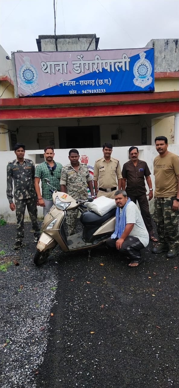 RGHNEWS प्रशांत तिवारी रायगढ़ पुलिस कप्तान श्री अभिषेक मीणा ,अति पुलिस अधीक्षक श्री अभिषेक वर्मा के मार्गदर्शन एवं सारंगढ़ एसडीओपी श्री प्रभात पटेल के निर्देशन में थाना प्रभारी डोंगरीपाली जितेन्द्र एसैया के नेतृत्व में डोंगरीपाली पुलिस द्वारा उड़ीसा से गांजा की एक और तस्करी को विफल किया गया है । टीआई जितेंद्र एसैया एवं हमराह स्टाफ द्वारा दिनांक 27/07/2021 को मुखबीर सूचना पर रेड कार्यवाही सोहेला बरमकेला मार्ग पर दुलोपाली के पास टीवीएस जुपीटर स्कूटी में गांजा परिवहन कर रहे युवक से 4 किलो मादक पदार्थ गांजा जप्त किया गया है । आरोपी पर एनडीपीएस एक्ट की कार्रवाई कर रिमांड पर भेजा गया है ।