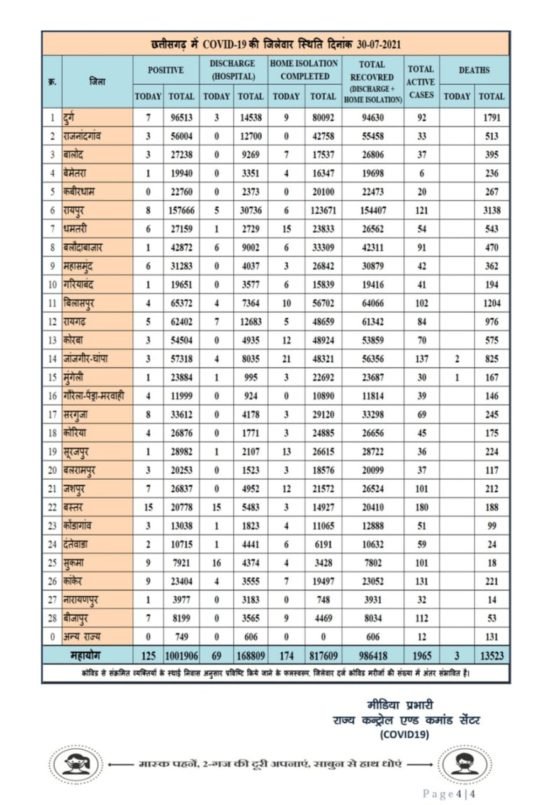 रायपुर 30 जुलाई 2021। प्रदेश में आज कोरोना के 125 नये मरीज मिले है। वहीं तीन लोगांे की मौत भी कोरोना संक्रमण के चलते हुइ्र्र है।