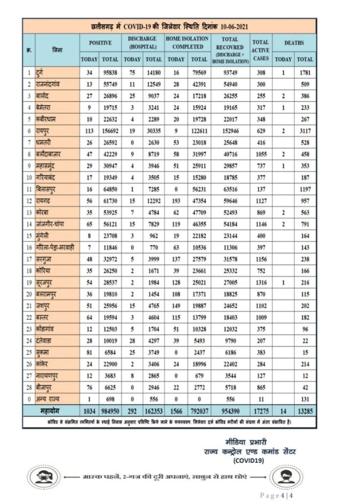 आज सबसे ज्यादा 113 नये मरीज मिले हैं, वहीं सुकमा में 81, बीजापुर में 76, बस्तर में 64, सूरजपुर में 54, जांजगीर में 65, रायगढ़ में 56 मरीज मिले हैं। बालोद, रायपुर, बलौदाबाजार, कोरबा और जांजगीर में 2-2 मौत हुई है।
