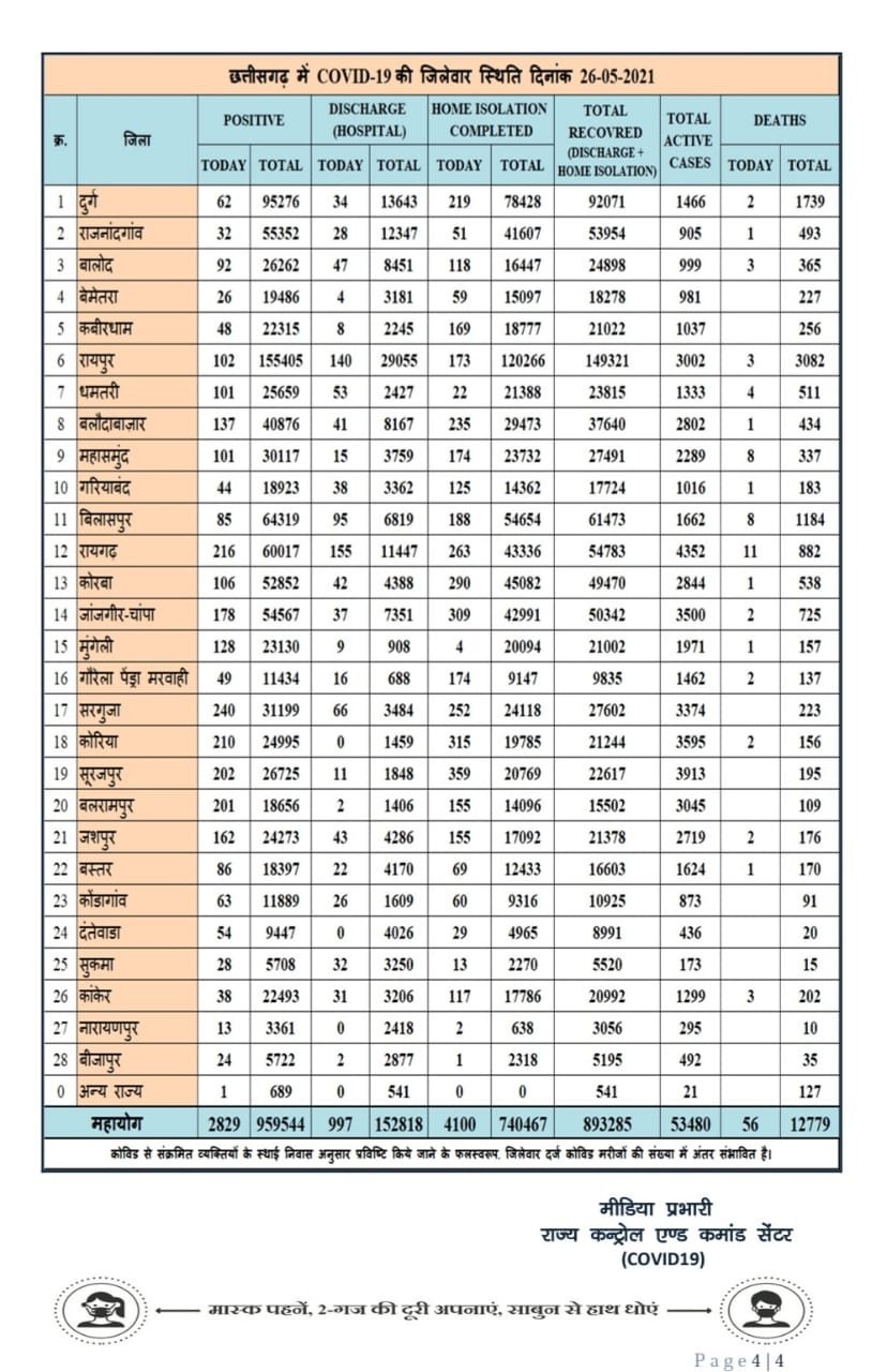 पिछले 24 घंटे में 56 मौतें हुई है। जिलेवार कोरोना के आंकड़े आज भी सरगुजा में सबसे ज्यादा है। सरगुजा में 240 कोरोना के मरीज मिले हैं, जबकि रायगढ़ में 216, जांजगीर में 178 मरीज मिले हैं।रायगढ़ आज भी मौत के आंकड़ों में टॉप पर है, यहां 11 लोगों की जान गयी है,