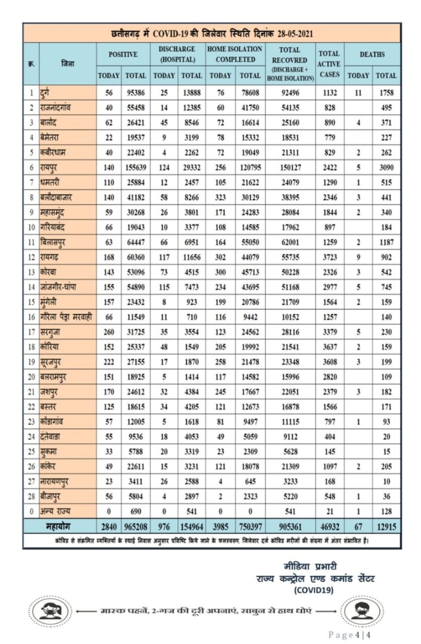 छत्तीसगढ़ में आज कोरोना की स्थिति सामान्य रही। प्रदेश में आज जहां 2840 नये मरीज मिले, तो वहीं 67 लोगों की मौत भी हुई है। प्रदेश में मरीजों की संख्या में जरूर कमी देखी जा रही है, लेकिन मौत के आंकड़े नहीं घट रहे हैं, प्रदेश सरकार के लिए ये चिंता की बात है। छत्तीसगढ़ में आज 4961 मरीज कोरोना से स्वस्थ्य हुए हैं।