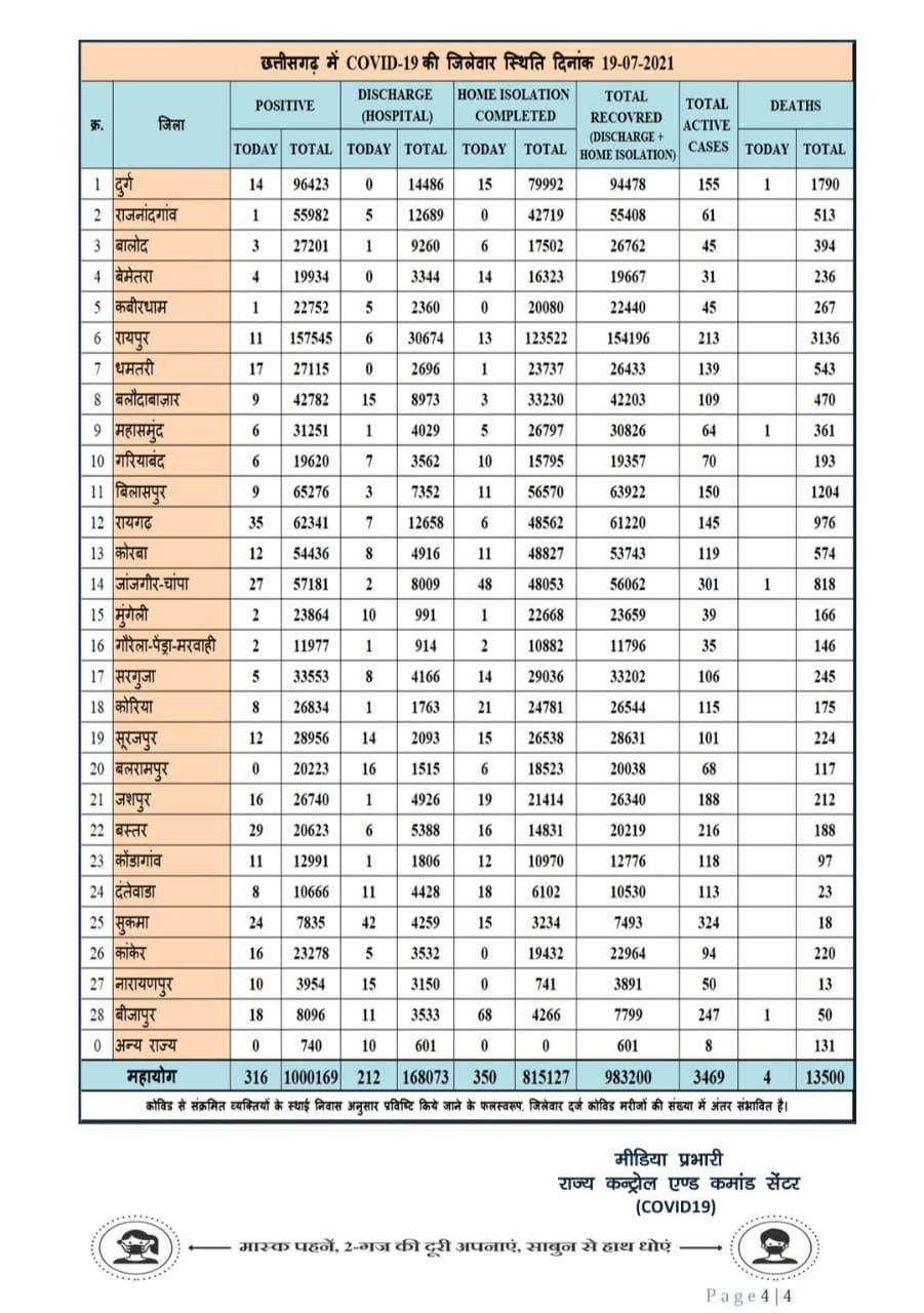 प्रदेश में आज कुल एक्टिव केस 3469 रहे हैं। रायगढ़ में आज सबसे ज्यादा 35 नये मरीज मिले हैं, जबकि बस्तर में 29, जांजगीर में 27, बीजापुर में 18, कांकेर में 16, सुकमा में 24, रायपुर में 11, धमतरी में 17, दुर्ग में 14 जशपुर में 16, सूरजपुर में 12, नारायणपुर में 10, कोंडागांव में 11 नये मरीज मिले हैं।