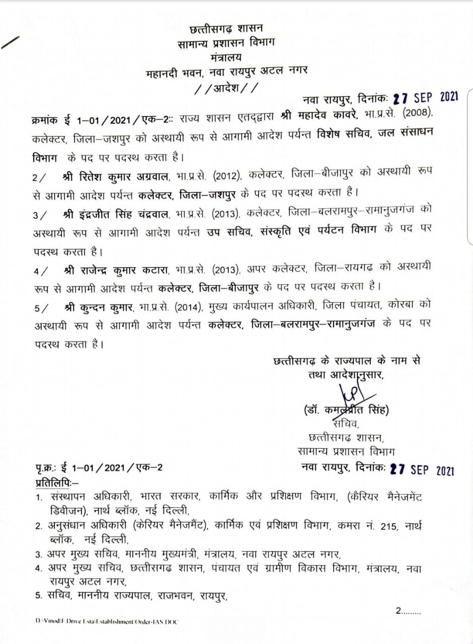 रायपुर। छत्तीसगढ़ सरकार ने सोमवार को पांच आईएएस अधिकारियों का तबादला किया है. इनमें जशपुर कलेक्टर महादेव कावरे को मंत्रालय में शिफ्ट करते हुए विशेष सचिव, जल संसाधन विभाग नियुक्त किया गया है. वहीं बीजापुर कलेक्टर रितेश कुमार अग्रवाल को जशपुर का नया कलेक्टर नियुक्त किया गया है.सामान्य प्रशासन विभाग की ओर सचिव डॉ. कमलप्रीत सिंह की ओर से सोमवार को जारी आदेश में अपर कलेक्टर रायगढ़ राजेंद्र कुमार कटरा को बीजापुर जिले का कलेक्टर नियुक्त किया गया है. इसके अलावा मुख्य नगर पालिका अधिकारी कोरबा कुंदन कुमार को कलेक्टर बलरामपुर-रामानुजगंज नियुक्त किया गया है. वहीं बलरामपुर-रामानुजगंज इंदरजीत सिंह चंद्रवाल को उपसचिव, संस्कृति एवं पर्यटन विभाग नियुक्त किया गया है.