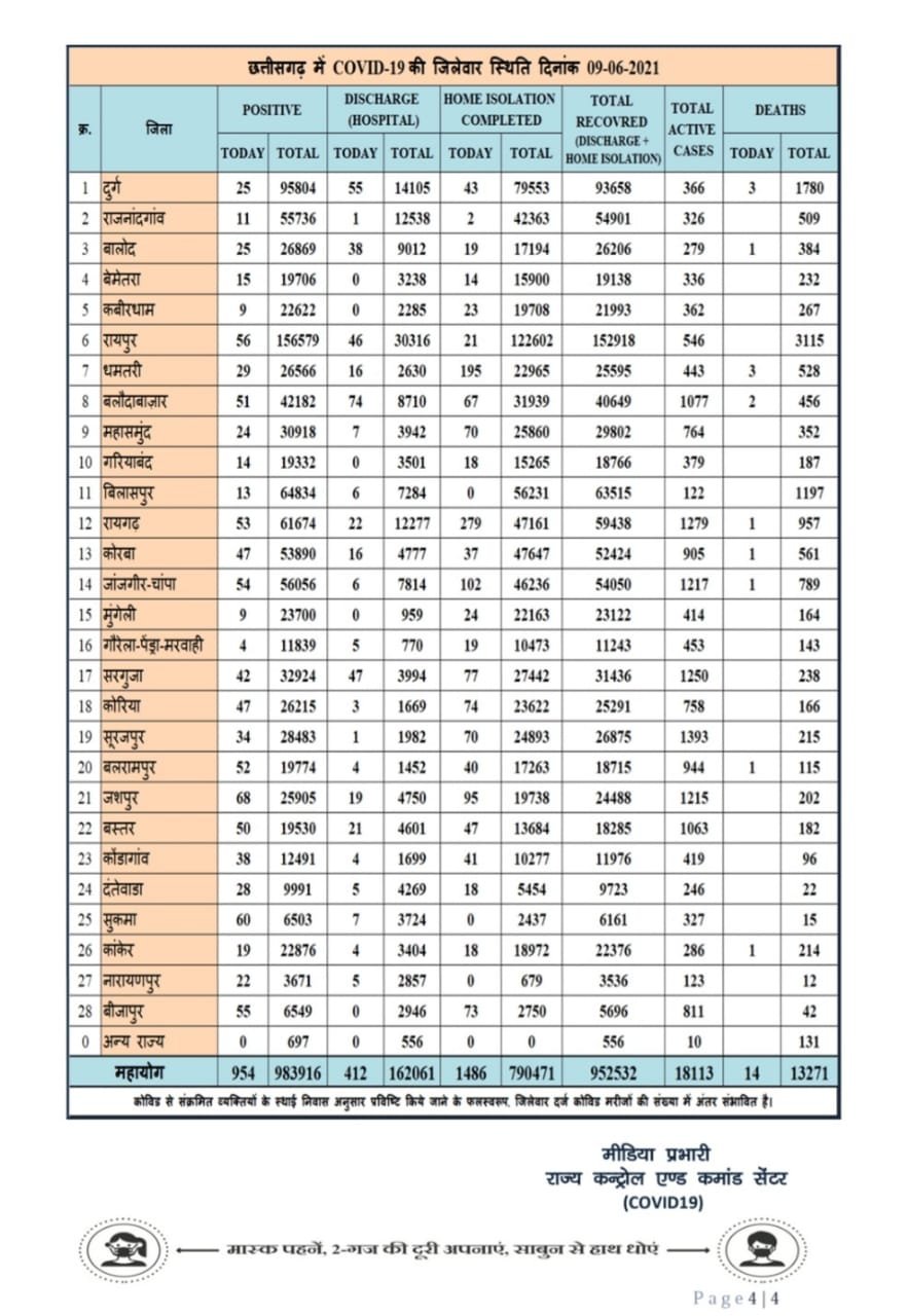 रायपुर । छत्तीसगढ़ में कोरोना का आंकड़ा लगातार कम हो रहा है। बुधवार को कोरोना का आंकड़ा 954 रहा। इससे पहले रविवार को ये आंकड़ा 999 का रहा था। प्रदेश में करीब 60 दिन बाद कोरोना मरीजों की संख्या 1000 से कम आ रही है। प्रदेश में मौत भी आज बेहद कम हुई है, आज मौत का आंकड़ा 14 का रहा है। वहीं 1898 मरीज आज स्वस्थ्य भी हुए हैं। प्रदेश में अब एक्टिव केस घटकर सिर्फ 18 हजार 113 रह गये हैं।