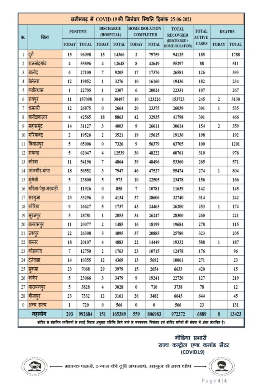 रायपुर। छत्तीसगढ़ में कोरोना से जुड़ी अच्छी खबरें आ रही है । प्रदेश में कोरोना का संक्रमण घटकर 300 से भी कम आ गया है। प्रदेश में आज 293 मरीज मिले हैं, वहीं 8 मरीजों की मौत भी हुई है। मरीजों की जिस रफ्तार में संख्या घटी है, उस रफ्तार में मौत के आंकड़े कम नहीं हो रहे हैं। प्रदेश में आज कुल 710 मरीज स्वस्थ्य हुए हैं।