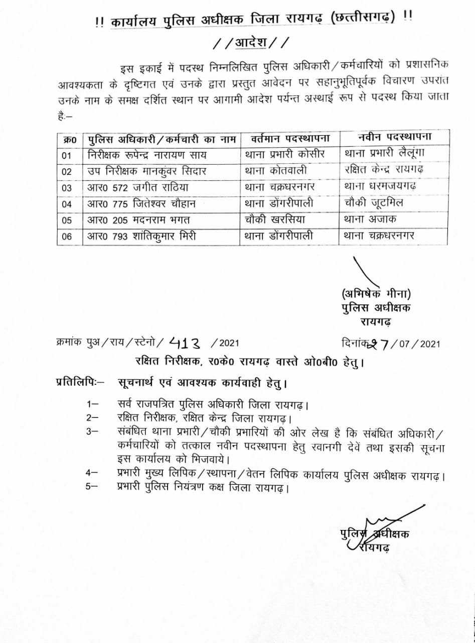 पुलिस अधीक्षक अभिषेक मीणा द्वारा आज दिनांक 27/07/2021 को 6 अधिकारी, कर्मचारियों का स्थानांतरण आदेश अधिकारियों के प्रशासनिक आवश्यकता अनुसार एवं कर्मचारियों के द्वारा प्रस्तुत आवेदन पत्र पर विचार करते जारी किया गया है । नये आदेश अनुसार थाना प्रभारी कोसीर निरीक्षक रूपेंद्र नारायण साय को लैलूंगा थाने की जिम्मेदारी दी गई है । स्थानांतरण आदेश अनुसार उपनिरीक्षक मानकुंवर सिदार को थाना कोतवाली से रक्षित केंद्र तथा चार आरक्षकों को उनके द्वारा प्रस्तुत पत्र पर सहानुभूति पूर्वक विचार करते हुए नवीन थानों में पदस्थ किया गया है ।