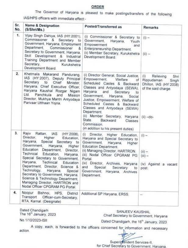 Transfer of 4 IAS/HPS officers चंडीगढ़। राज्य में तबादलों का दौर जारी है। आए दिन कई विभागों में अधिकारियों के तबादले किए जा रहे है। तो वहीं प्रतिदिन किसी न किसी जिले में आईएएस और आईपीएस अधिकारियों का भी स्थानांतरण किया जा रहा है। इसी बची एक बार फिर तत्काल प्रभाव से 4 IAS / HPS अधिकारियों के ट्रांसफर कर नवीन पदस्थापना सौंपी गई है। शासन ने आदेश जारी कर दिया है।