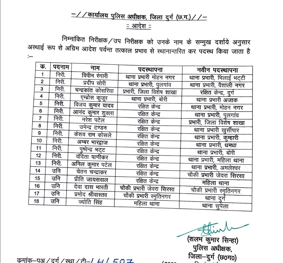 CG Police TI SI Transfer इसी कड़ी में प्रदेश के वीआईपी जिले में शुमार दुर्ग में भी पुलिस अफसरों के तबादले का लिस्ट सामने आया है। एसपी शलभ सिन्हा की अनुशंसा पर जिले के 12 थाना प्रभारी और 5 उपनिरीक्षकों के कार्यक्षेत्र में बदलाव किया गया है। सूची में अमलेश्वर समेत कई थानों के प्रभारियों को भी बदल दिया गया है।